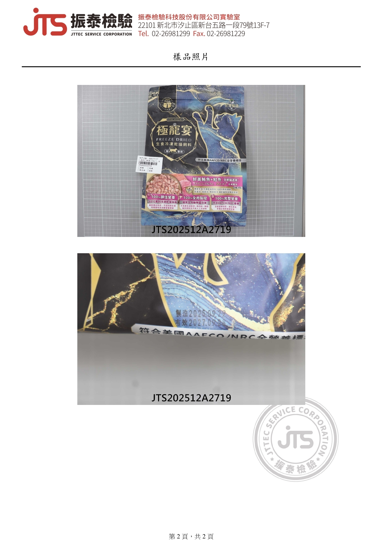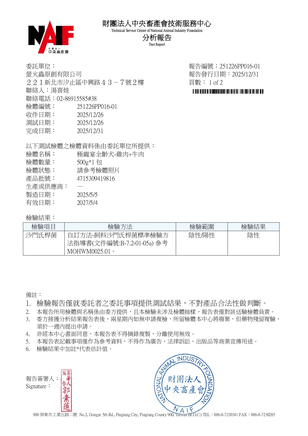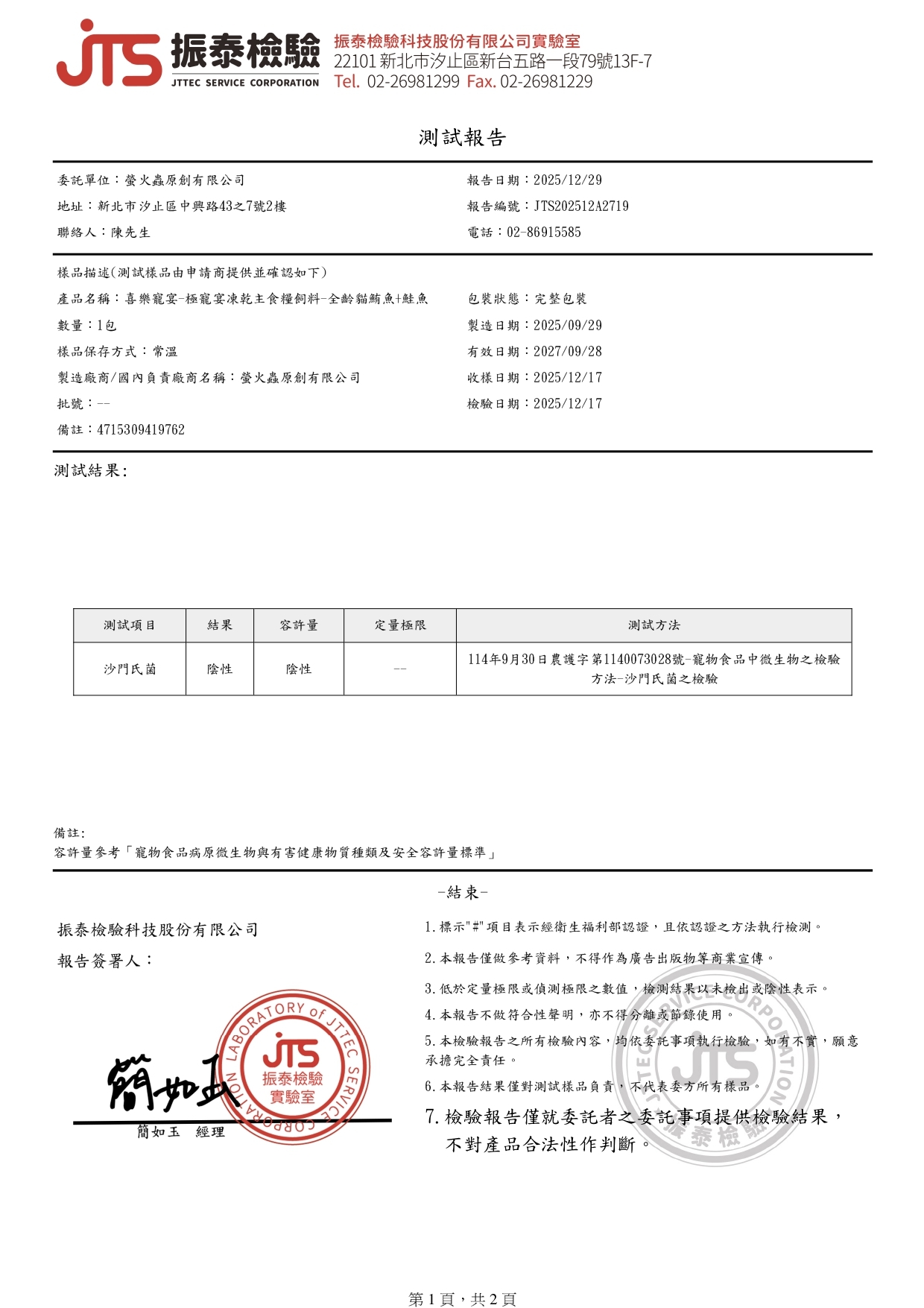同時,為全面確保極寵宴系列產品之品質與安全,本公司亦主動擴大檢測範圍,將現有庫存產品包含:極寵宴-全齡犬雞肉+鴨肉(製造日期:2025/9/29)、 極寵宴-全齡犬雞肉+鴨肉(製造日期:2025/9/29)、極寵宴-全齡貓雞肉+火雞肉(製造日期:2025/10/6)及 極寵宴-全齡貓雞肉+火雞肉(製造日期:2025/10/6),送交「振泰檢驗」進行檢測。根據2025 年 12 月 29 日之振泰檢驗最新報告顯示,上述全齡犬貓四款產品之沙門氏桿菌檢測結果皆為陰性,符合安全標準。