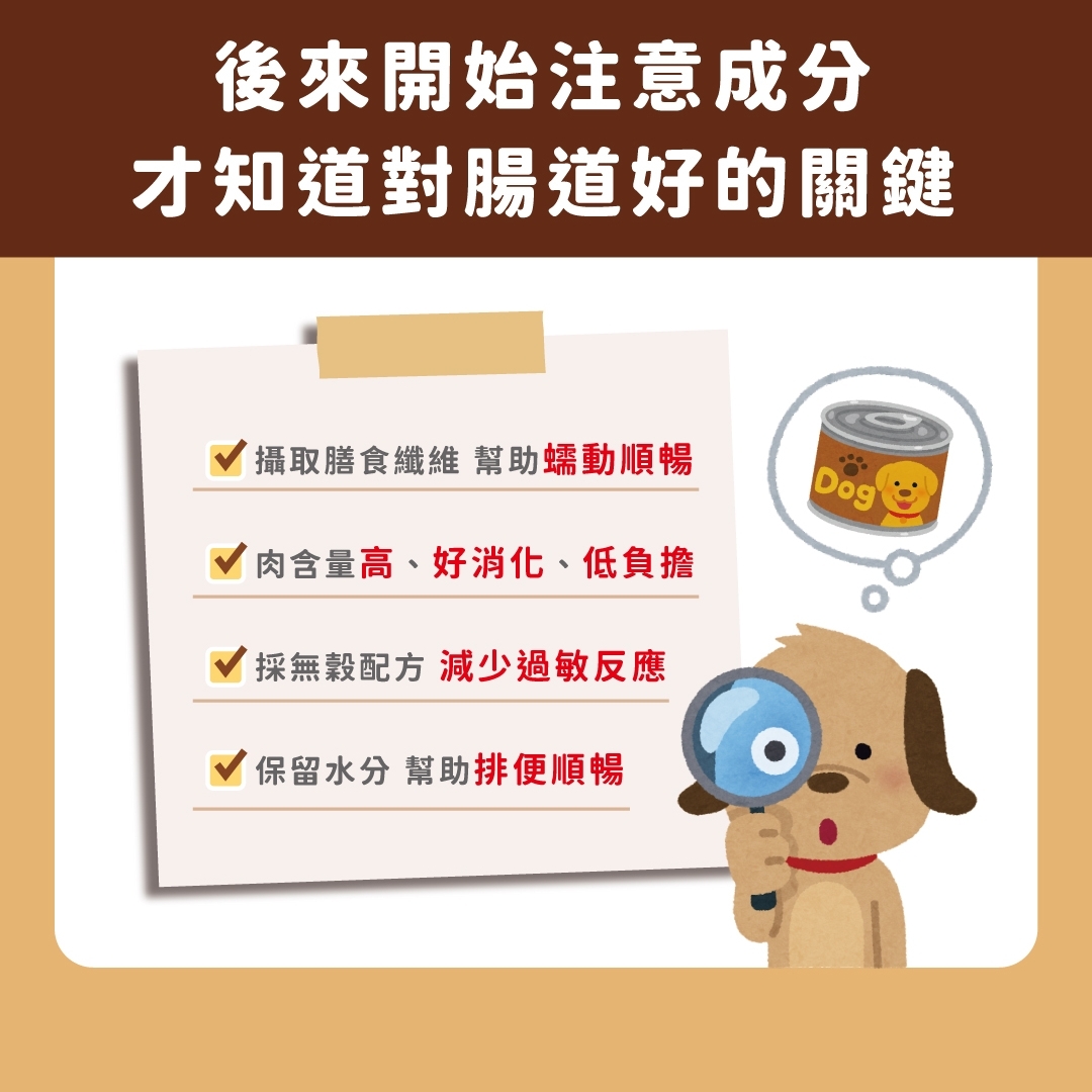 從根本改善狗狗的腸道問題,最有效的方式就是從飲食著手。選擇富含對腸道有益成份的食物,能幫毛孩建構健康的腸道系統。喜樂寵宴澳洲配方全肉腸胃保健主食罐為毛孩的腸道健康提供全面守護