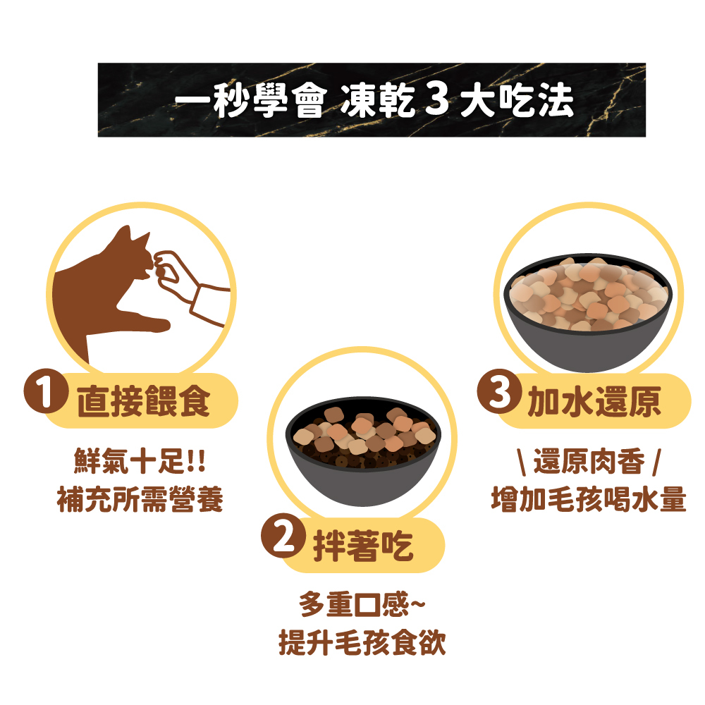 ● 餵食方式|拆封後即可食用,建議剝成適合毛孩食用的大小餵食。可當作零食餵食, 也可當作保健營養品加入飼料中能增添風味及豐富營養,還可加水還原成鮮食食用