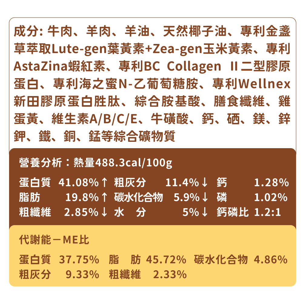 ✦ 鮮嫩牛肉+鮮嫩羊肉製成,高蛋白質、低熱量、低脂肪,低敏食材