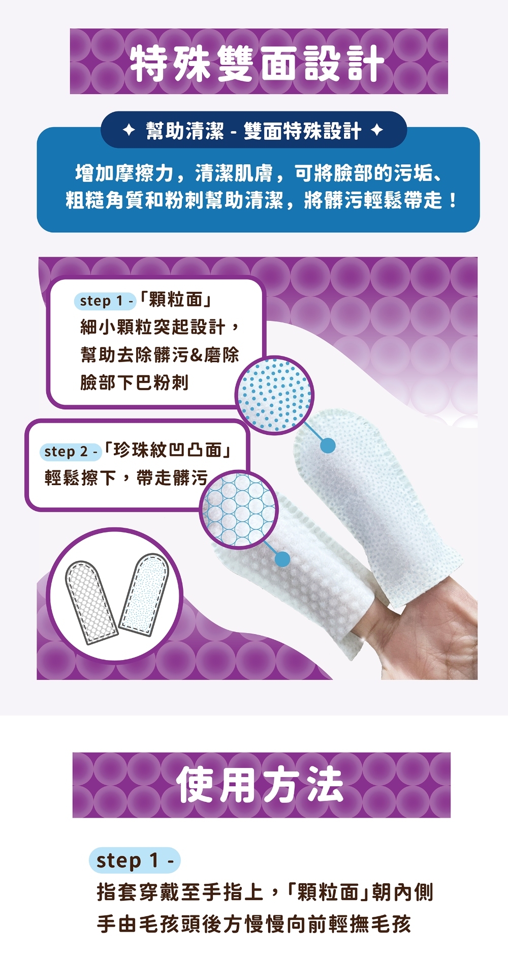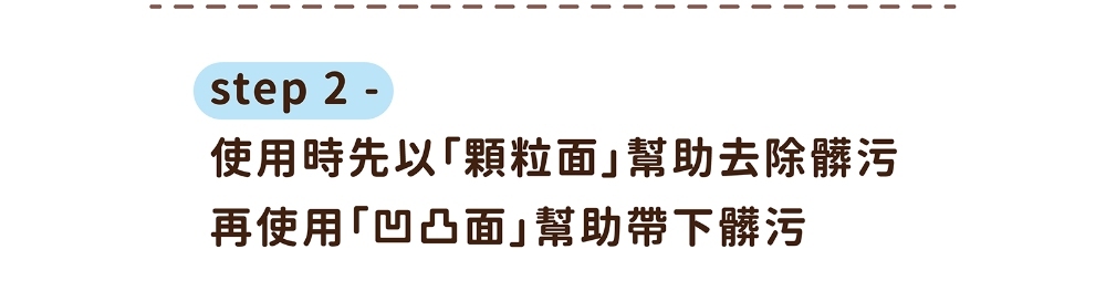 「顆粒面」- 細小顆粒突起設計,來回摩擦去除髒污
